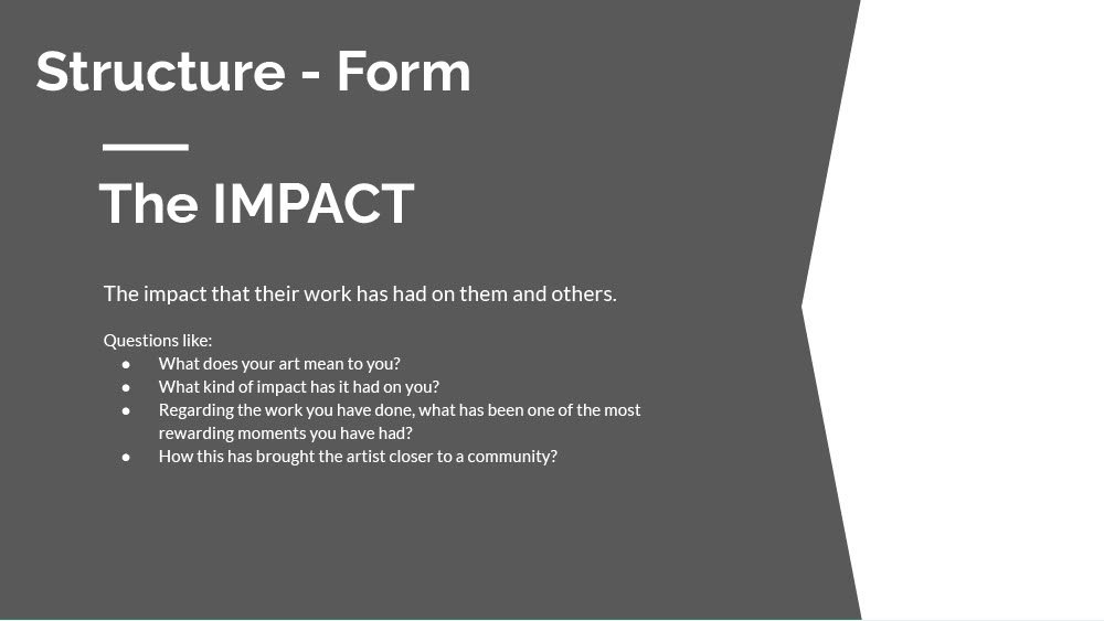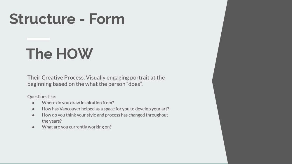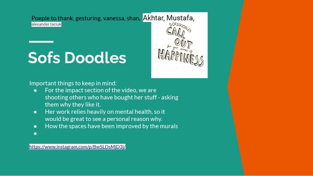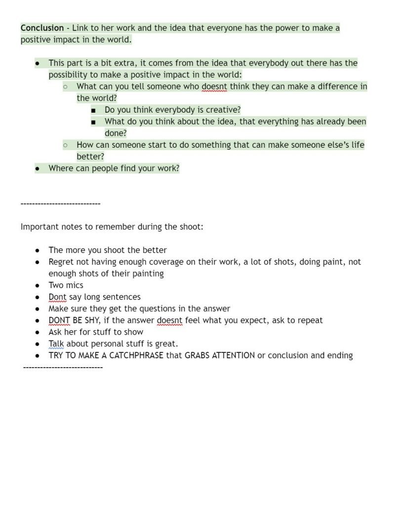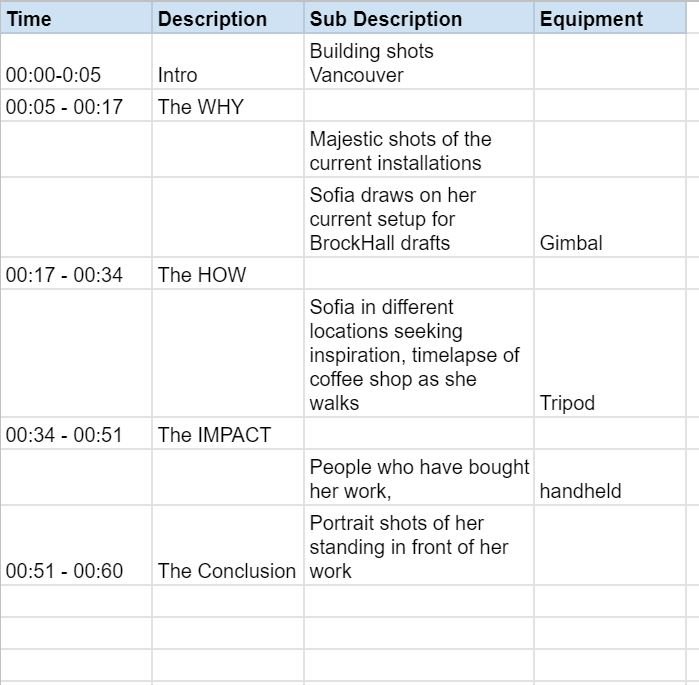 After this, Sof and me spoke about filming spots that would illustrate “the why”, “the how” and “the impact”. From here came the locations, either places Sof used to gather inspiration or where artworks where actually being displayed and the impact they were having. Below is the original minute to minute description of what originally would be just a one minute video – in the editing stage it became a 3 minute video.