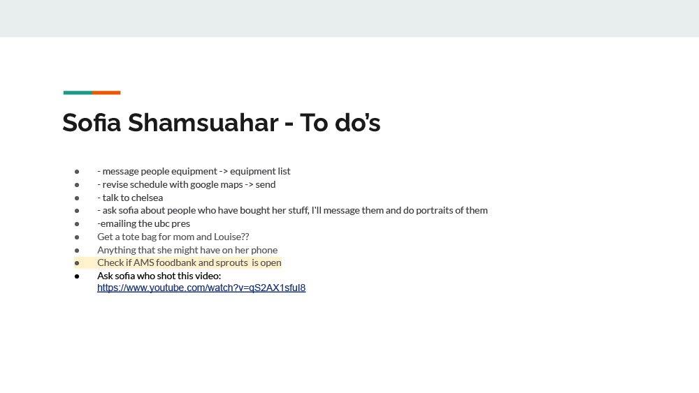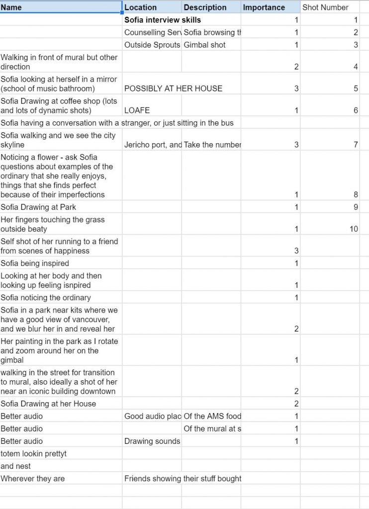 So much of the best footage was captured after first day of production. I noticed we had still a lot of imagery to cover so I developed this “pick-up” shotlist and we shot for another day. You can see how rough the list was and how I also used it as an opportunity to fix for mistakes that I did in the first day.