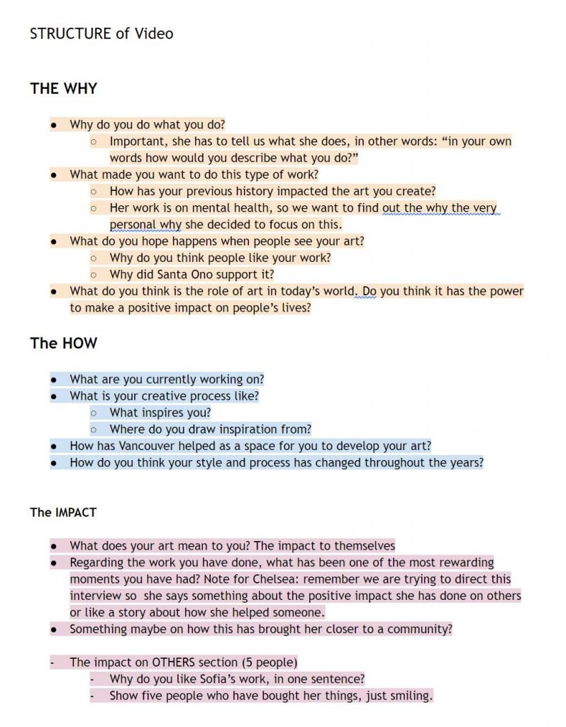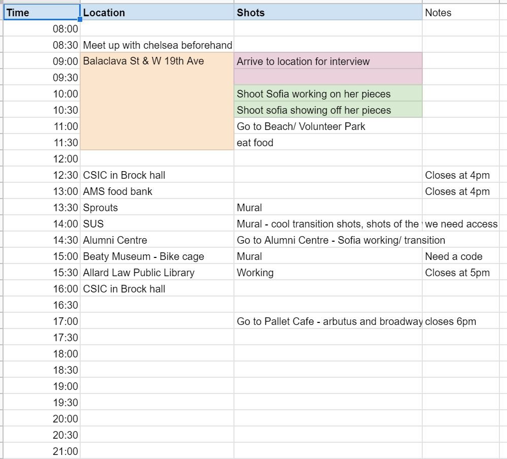 From here a super rough schedule was drafted, but most importantly interview notes were made. Here I got the help of my good director friend Chelsea Xinyi Chen – she is an amazing director, and she led the interview while I held the camera. We filmed all of the interview in Sofia’s home, only natural light.